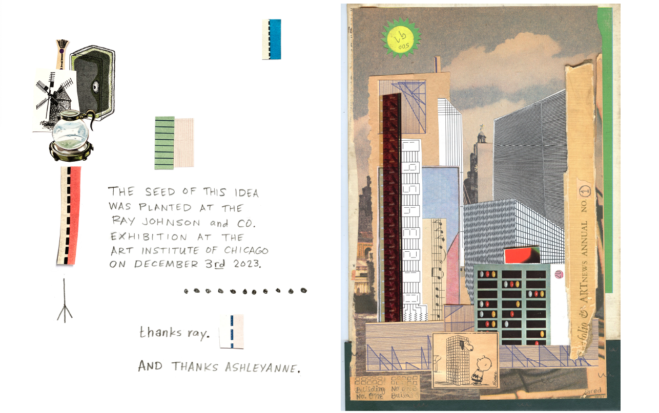 Buildings No. 1 came about after going to the Ray Johnson exhibit in Chicago At The Art Institute. I was inspired by his creation of “moticos”. I liked the wordplay of buildings/ buildings and could see the infinite landscape to build upon. This is No. 1 because I hope this to be a continuing project.